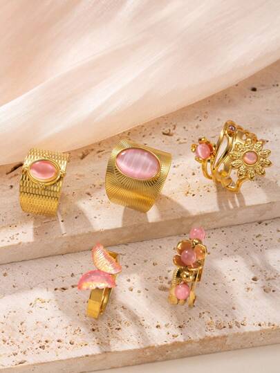 5pcs Vintage Asymmetrical Cat Eye Butterfly Stainless Steel Adjustable Rings Set, Suitable For Women & Men, Fit For Holiday, Wedding, Engagement, Date, Daily Wear - Gold - View 1