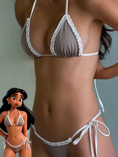 Women's Bikini Swimsuit, Cute Bohemian Style Plaid Print With Built-In Bra, Suitable For Vacation, Beach, Pool And Casual Wear, Ideal For Autumn/Winter Holidays, Valentine's Day, Christmas, New Year Parties, And 2026 Spring/Summer Beach Attire - Coffee Brown - View 6
