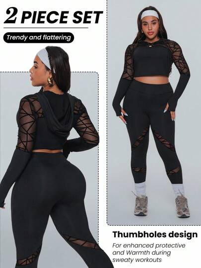 Easithlete Plus Size Women Geometric Mesh Spliced Crop Top And Leggings Sports Suit Workout Women Sets - Black - View 1