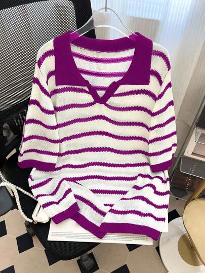 GlowEve CURVE Plus Size Casual Commuter Striped Short Sleeve Knit Top - Hot Pink - View 7