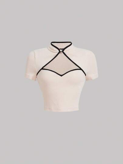 SHEIN MOD Contrast Binding Cut Out Front Crop Tee - Apricot - View 1