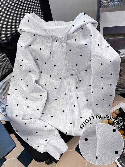 Resyla Fall, Outerwear, Autumn/Winter, Seasonal Jacket, Back To School, Casual, Sportswear, Holiday, Winter Outwear, Versatile Fashionable Polka Dot Print Women's Long Sleeve Hooded Sweatshirt - Grey - View 1
