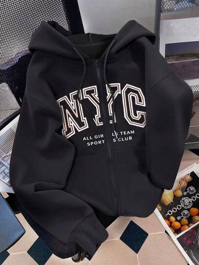 Resyla Women's Hooded Zip-Up Sweatshirt, Letter Print Pattern, Casual Jacket For Teachers, Back To School, Graduation Season, Daily Wear, Winter Outerwear, & Versatile, Women's Hooded Long Sleeve Sweatshirt - Black - View 1