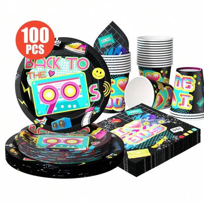 Retro 90s Cassette Tape Disposable Plates, Napkins, Cups - One-Time Party Supplies Set, Fits 25 Guests, Disposable Paper Plates Party Tableware Suitable For Birthday, Wedding, Theme Party, Family Picnic - Multicolor - View 1