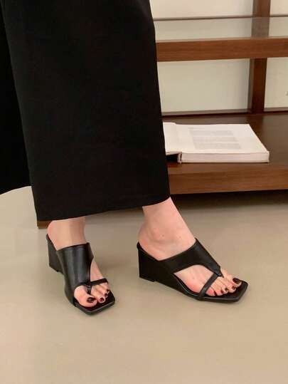 Retro Square Toe Slip-On Women's High Heel Sandals, Open Toe Platform Wedge Heels, Fashion Roman Thong Sandals For Spring/Summer - Black - View 1