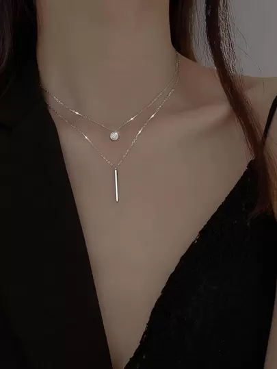 Rhinestone & Stick Charm Layered Necklace - Silver - View 1