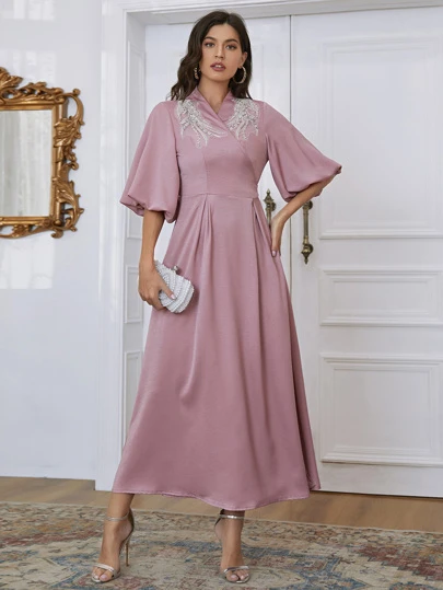 Modelyn Rhinestone Beaded Tie Back Surplice A-line Dress - Pink - View 1