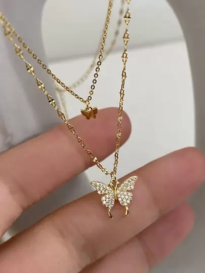 Rhinestone Butterfly Charm Layered Necklace - Yellow Gold - View 1