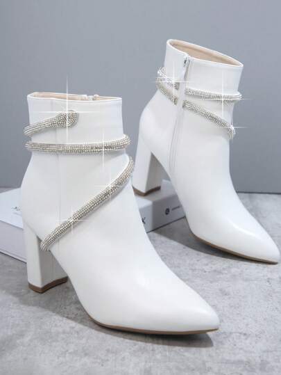 SHUZIA Rhinestone Decor Side Zipper Chunky Heeled Ankle Boots - White - View 1