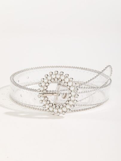 1pc Fashionable Belt For Women With Rhinestone Decor And Three-Level Round Buckle Design, Perfect For Dress Or Jeans - Clear - View 1