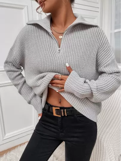 SHEIN Unity Ribbed Knit Half Zipper Drop Shoulder Sweater Knit Pullover Fall Winter Outfit - Light Grey - View 1