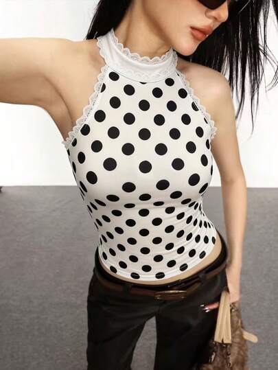 Rina Fox Women's Halter Neck Polka Dot Lace Patchwork Sexy Y2K Camisole - Beige - View 1