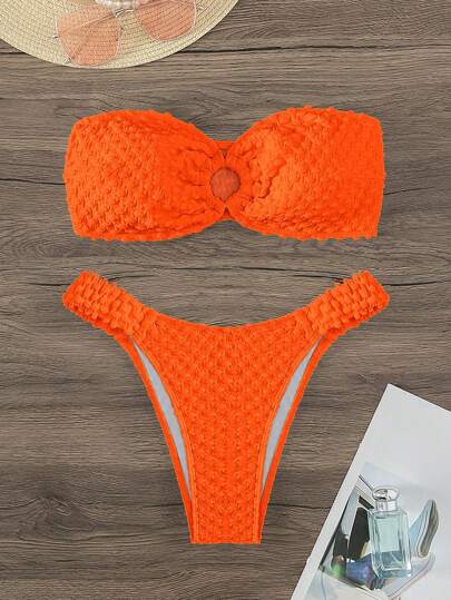 SHEIN Swim Summer Beach Ring Linked Bandeau Bikini Set, Bathing Suit - Orange - View 1