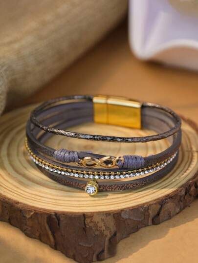 1pc Bohemian Multi-Layer PU Rhinestone Magnetic Clasp Bracelet, Infinity Symbol Wrap Charm Bracelet, Suitable For Daily Wear Or Music Festivals - Gray Infinite - View 1
