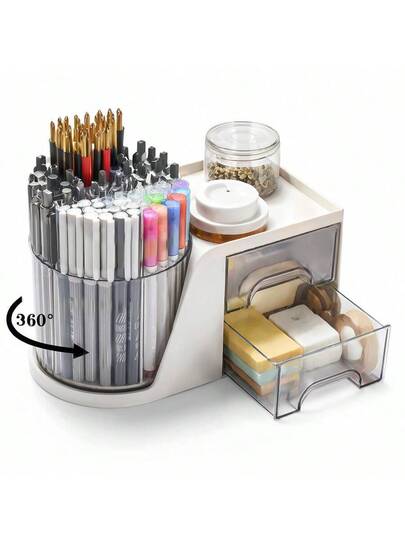 Rotating Desk Organizer With 2 Drawer, Pencil Pen Holder For Desk, Desk Organizers And Accessories With 4 Compartments + Drawer For Office Home Art Supplies (White) - White - View 9
