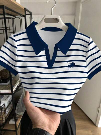 Rovax Women's Short Polo Shirt With Striped Equestrian Print, Contrast Collar - Multicolor - View 1