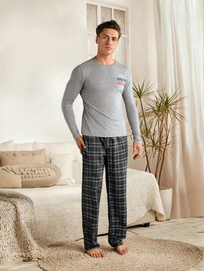 RueChic Men's Letter Printed Long Sleeve T-Shirt And Plaid Pants 2pcs/Set - Grey - View 1
