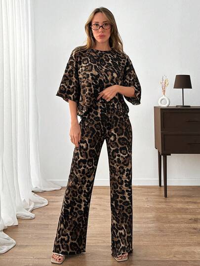EURMUSE OVER SIZE T-SHIRT & ELASTICAL WAISTED PANT ALL OVER LEOPARD CO ORD SET - Multicolor - View 1