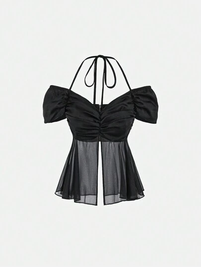 SHEIN Unity Ruffle Neck Spaghetti Strap Strapless Shirt - Black - View 1
