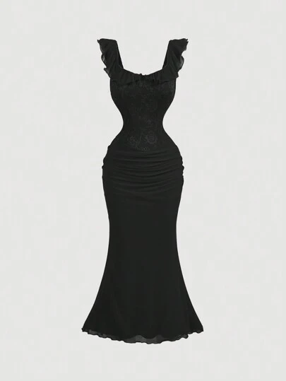 SHEIN MOD Ruffled Collar Ruched Romantic Dress For Women - Black - View 1
