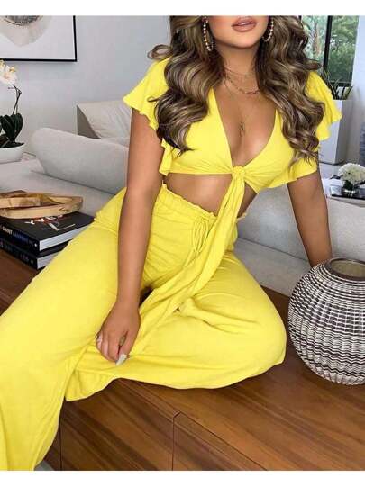 Ruffles Sleeve Knotted Top High Waist Pants Set - Yellow - View 1