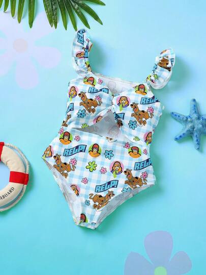 SCOOBY-DOO X SHEIN Young Girl Cute Gingham Flower & Cartoon Pattern Ruffle Armhole Cutout Ruched Bust One-Piece Swimsuit - Multicolor - View 1
