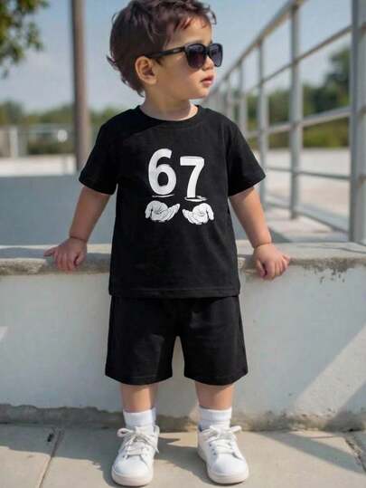 SHEIN 2pcs Baby Boys' Casual Collegiate Comfortable Fashion Minimalist Practical Soft Short Sleeve T-Shirt And Contrast Color Shorts Set, Suitable For Daily Wear, School, Outings, Sports, Spring/Summer - Black - View 1