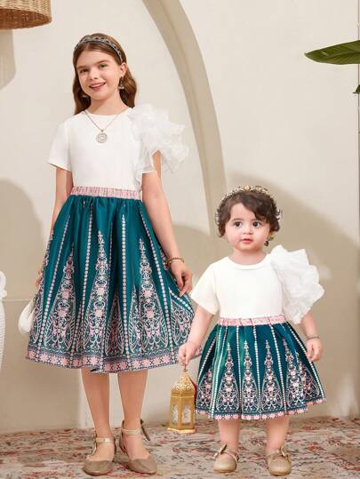 SHEIN 2pcs Baby Girl Summer Holiday Floral Pattern Ruffle Trim Top And Skirt Set - Green - View 1