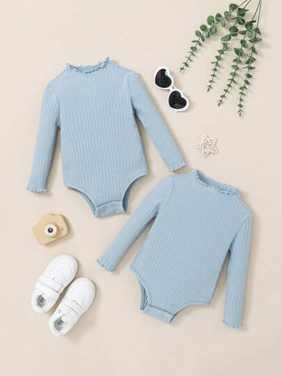 SHEIN 2pcs Baby Girls' Casual Solid Color Bodysuit - Blue - View 1