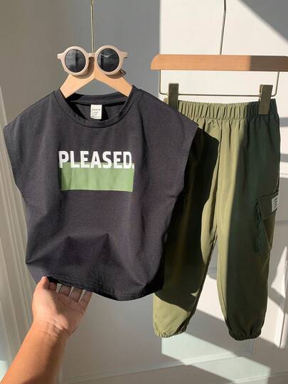 SHEIN 2pcs/Set Kids Boys Casual Letter Print Crew Neck Loose Short Sleeve T-Shirt And Relaxed Fit Pocket Sweatpants Set - Multicolor - View 1