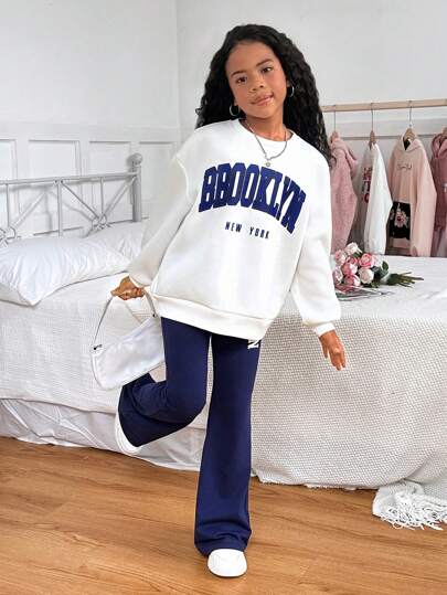 SHEIN 2pcs/Set Tween Girls' Casual School Style Contrast Color Print Crew Neck Long Sleeve Sweatshirt & Jogger Pants Set - White - View 1
