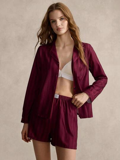 SHEIN 2pcs Striped Print Lapel Collar Women Pajama Set, Long Sleeve Top And Shorts - Black - View 1