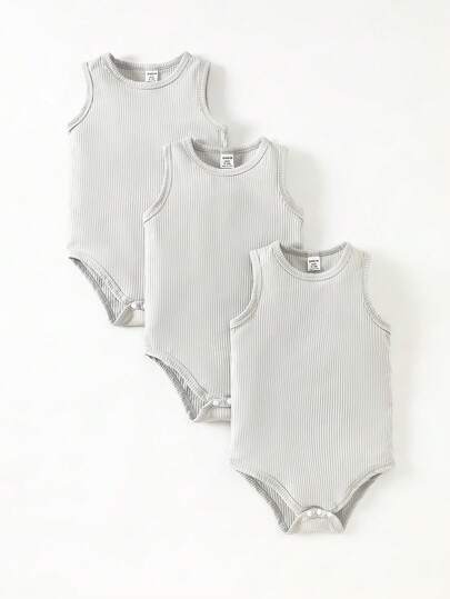 SHEIN 3pcs Baby Boy Comfortable Ribbed Knit Sleeveless Bodysuit Set - Grey - View 1