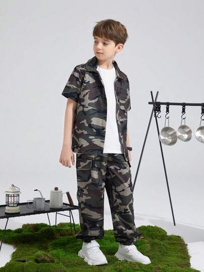 SHEIN 3pcs/Set Tween Boys' Loose Round Neck T-Shirt, Camo Shirt And Elastic Hem Long Pants Set - Army Green - View 1
