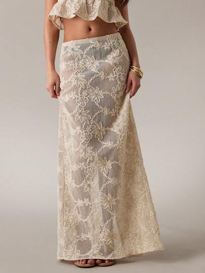 SHEIN BAE Apricot Textured Crochet Mesh Jacquard Skirt, Sheer Long Skirt, Elegant Skirt, Vacation Beach Skirt, Summer - Apricot - View 1
