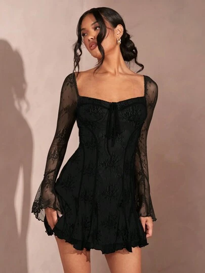 SHEIN BAE Black Lace Panel Ruffled Trim Midi Dress For Women,Valentine's Day,Valentine Outfits For Women - Black - View 6