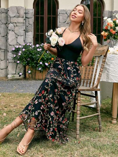 Zolique Deep V-Neck Embroidery Mesh Net Halter Dress - Multicolor - View 1