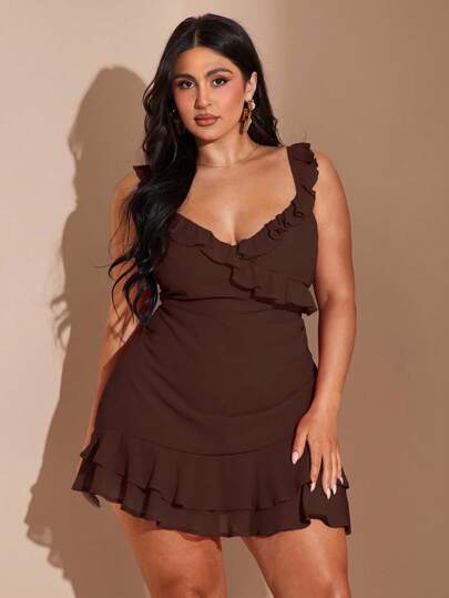 SHEIN BAE Plus Size Women's Elegant Romantic Sexy V-Neck Sweet Cute Versatile Date Red Ruffle Hem Mini Dress, Beach Resort Party Short Dress, Spring/Summer/ Plus Size Brown Dress/ Plus Size Ruffle Dress/ Chocolate Brown Dress - Coffee Brown - View 1