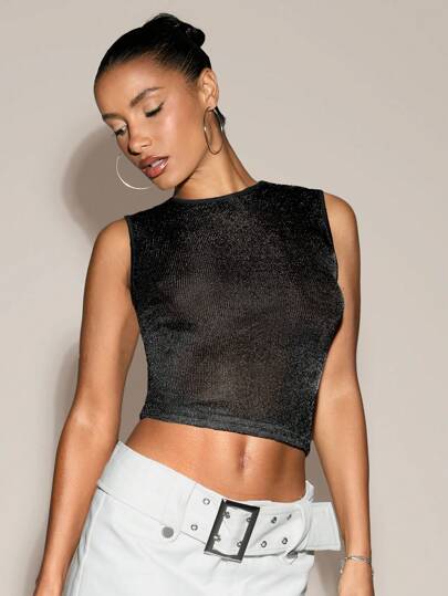 SHEIN BAE Silver Metallic Sheer Summer Sexy Women Black Crop Top For Going Out, Evening Date - Black - View 1
