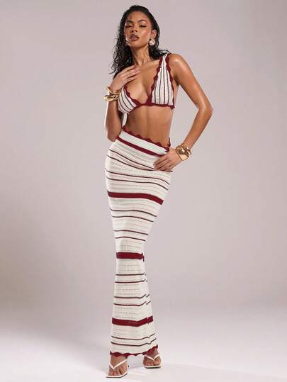 SHEIN BAE Women's Striped Print Fitted Casual Fashionable Sweater Skirt - Burgundy - View 1