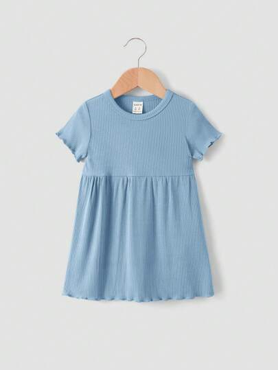 SHEIN Baby Ribbed Knit Lettuce Trim Smock Dress - Baby Blue - View 1
