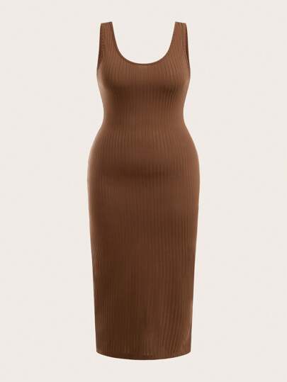 SHEIN BASICS Plain Color Knit Slim Fit Sleeveless Round Neck Plus Size Dress - Coffee Brown - View 1