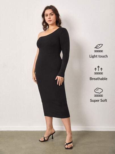 SHEIN BASICS Plus One Shoulder Bodycon Dress - Black - View 1