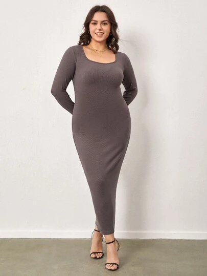 SHEIN BASICS Plus Scoop Neck Bodycon Dress - Mocha Brown - View 1