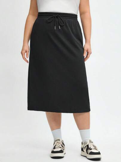 SHEIN BASICS Plus Solid Drawstring Waist Skirt/Summer - Black - View 1