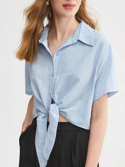 BizChic Button Front Knot Hem Shirt - Baby Blue - View 1