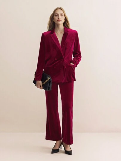 BizChic Lapel Neck Velvet Blazer & Pants - Red - View 1