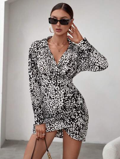 BizChic Women'S Leopard Print Turn-Down Collar Dress - Black and White - View 1