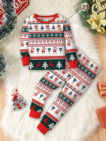 SHEIN Baby Boy Christmas Themed Snug Fit Cozy Long Sleeve Top And Pants Pajama Set, Featuring Classic Christmas Tree, Cartoon, And Reindeer Patterns, Suitable For Autumn/Winter - Multicolor - View 1