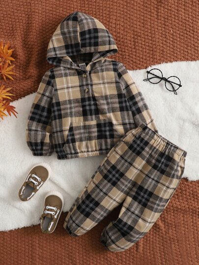 SHEIN Baby Boy Plaid Print Half Zip Hoodie & Pants - Multicolor - View 1